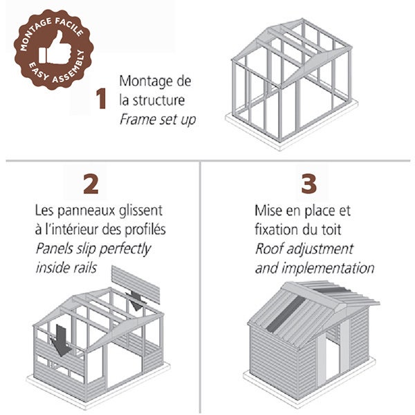 Le montage de cet abri de jardin ne nécessite pas de compétences ou d’outils spécifiques. La surface prévue doit être horizontale et dure et nous recommandons la réalisation d’une dalle en béton afin de faciliter l’entretien courant et la fixation de votre abri. Deux personnes peuvent assembler celui-ci en 6 heures avec un outillage courant (niveau à bulle, tournevis ou visseuse, clés ou douilles, échelle…). Le montage doit se faire sur un terrain dégagé pour éviter d’endommager les différents éléments. Certaines pièces présentant une forte prise au vent, un montage par temps clair évite tout risque. Une fois monté, votre abri devra être correctement ancré au sol à l’aide du kit fourni.