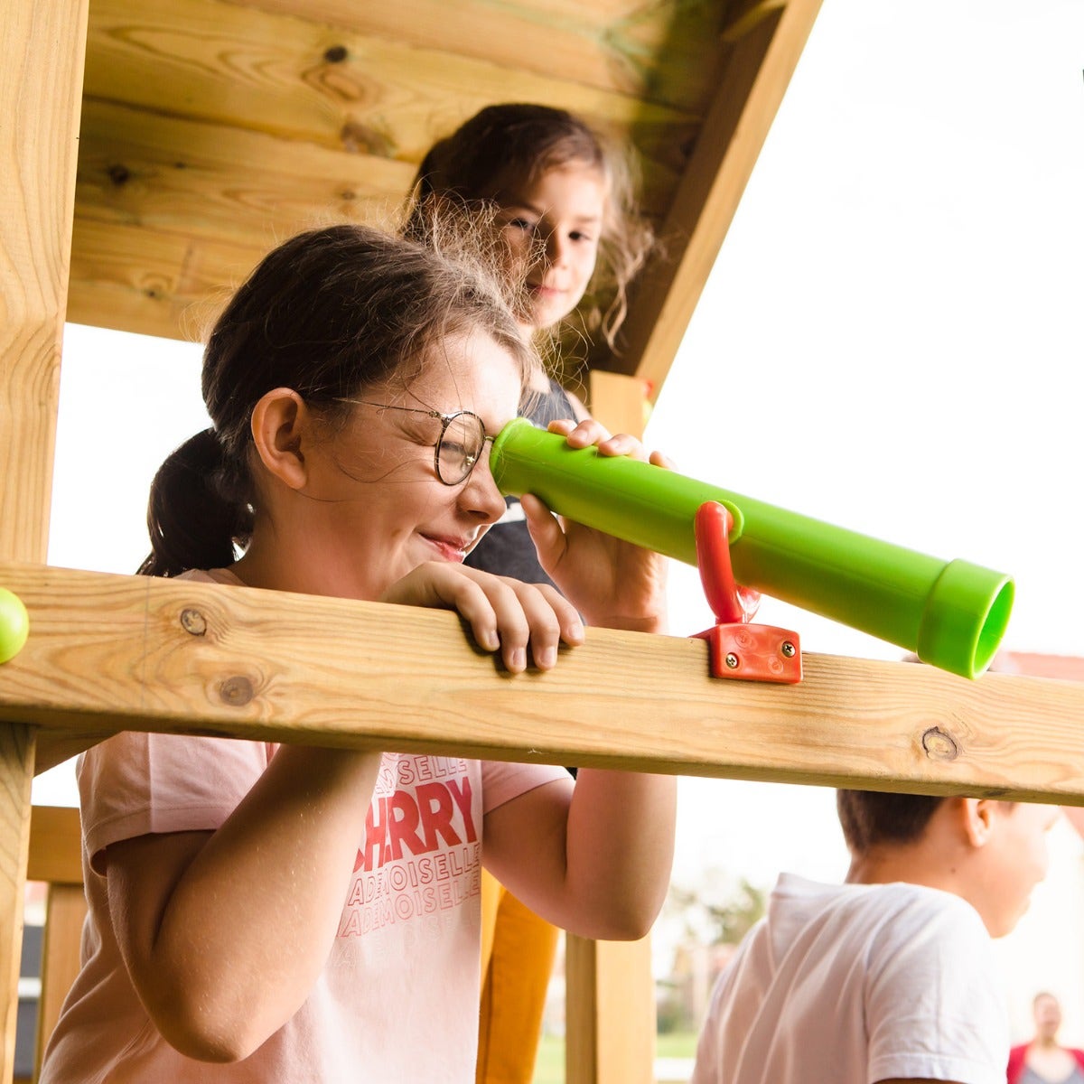 Les aires de jeux XPLORER ont de meilleures finitions et plus d’accessoires. En effet, le toit de la tour de jeux est en bois, le bac à sable est équipé d’un filet de protection. De plus, vos petits aventuriers pourront observer le royaume qui les entoure grâce au téléscope intégré à la tour. Enfin, les aires de jeux en bois XPLORER sont colorées plus vivement afin d’attirer l’attention de vos enfants : le sabot de toboggan et les poignées sont peintes en rouge et les balançoires sont vertes.
